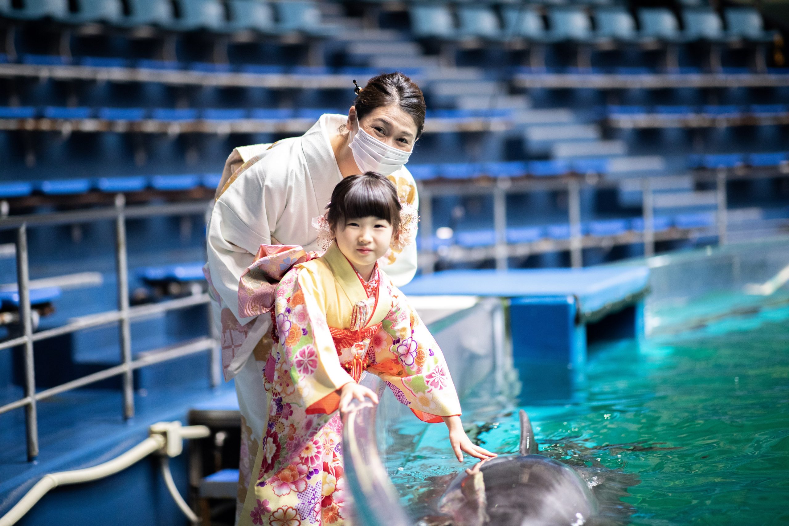 お好きな柄の着物を選び、プロによる着付けと丁寧なヘアメイクでおめかしした後は開館前のマクセル アクアパーク品川にて記念撮影。朝の光に照らされた輝く海の生きものとの記念ショットや、イルカに触れ合う瞬間の特別な撮影をお楽しみいただけます。撮影後は大きな窓から都心の景色を望む和食レストラン「味街道 五十三次」にてお祝い御膳コースをご用意し、ご家族水入らずで過ごすお子さまの晴れの日をお祝いいたします。