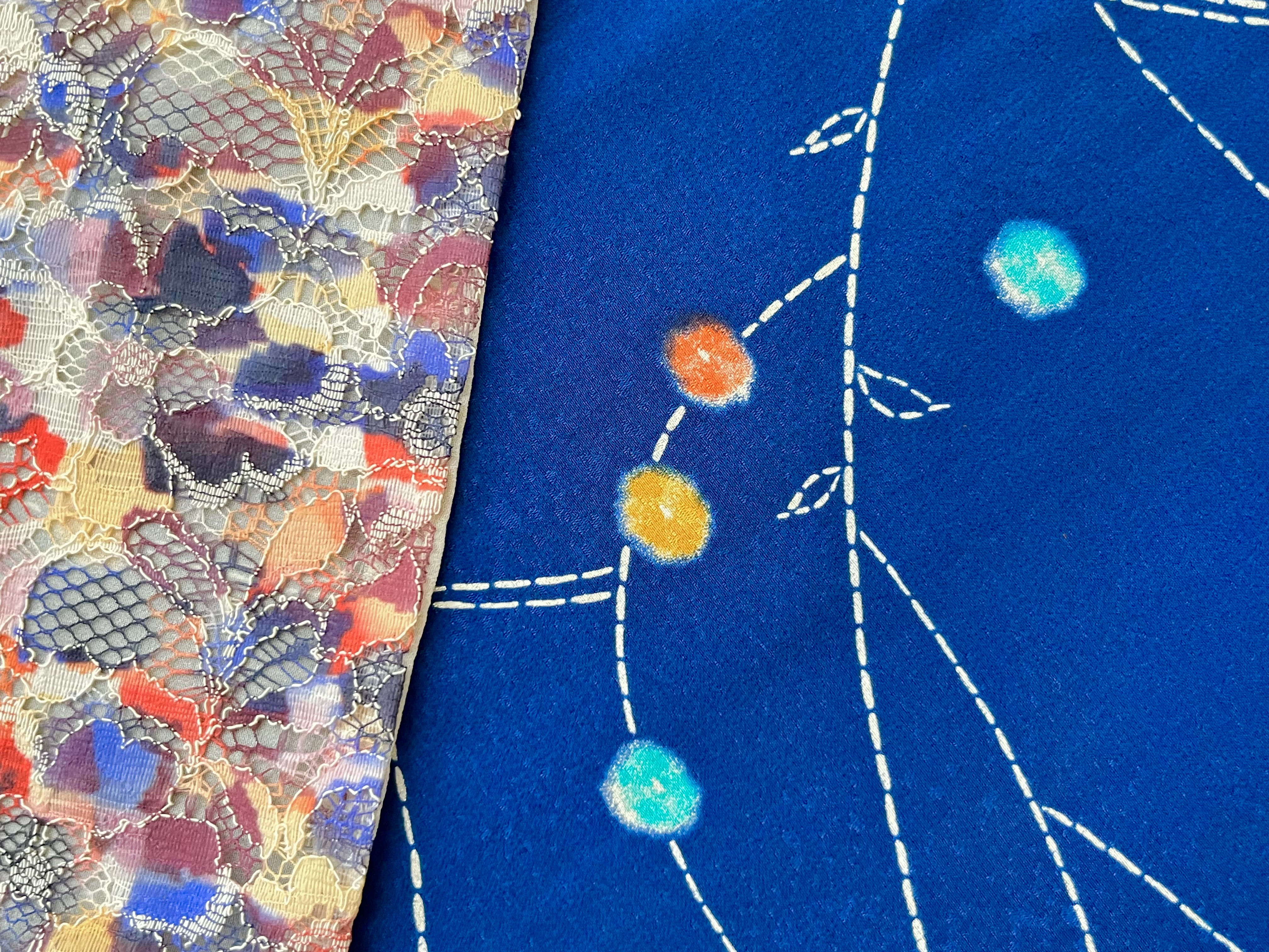 明るいブルーに、水草のような水玉模様が染められた正絹小紋です。