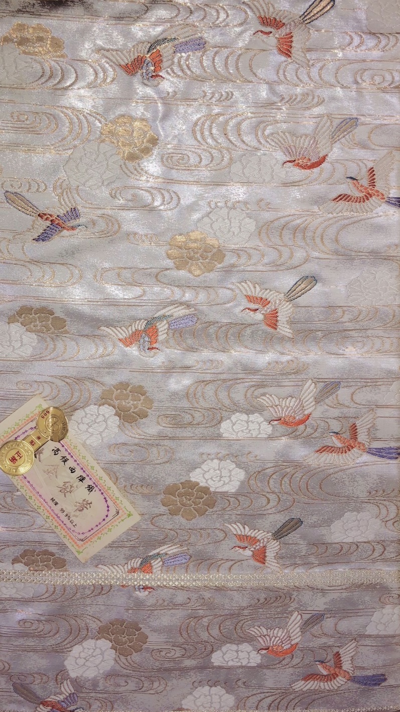 シルバーの地に観世水と鳥の文様が優雅な帯と、吉祥の花々がぎっしりの帯。