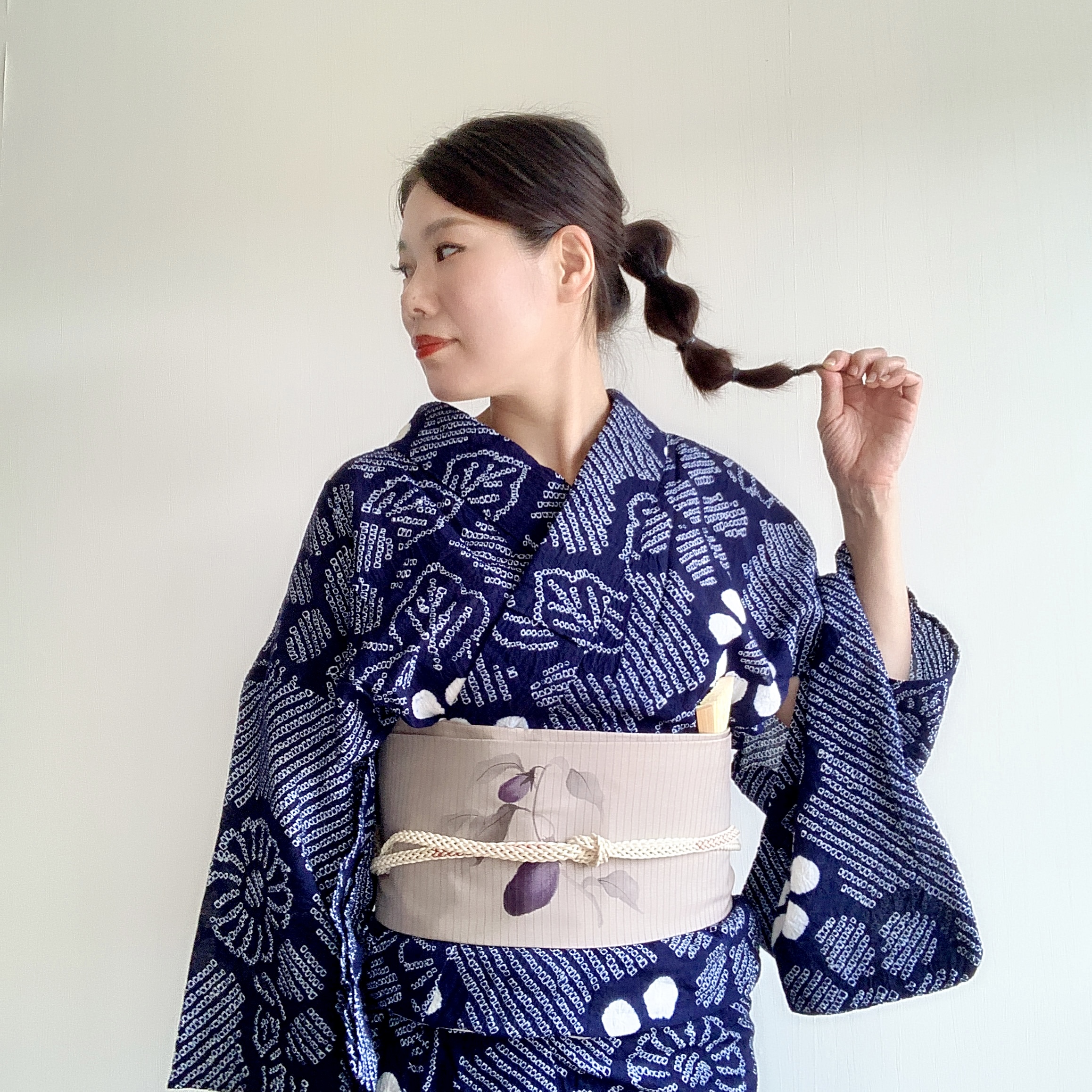 有松絞りの浴衣に、帯は茄子が主役の夏名古屋帯。
