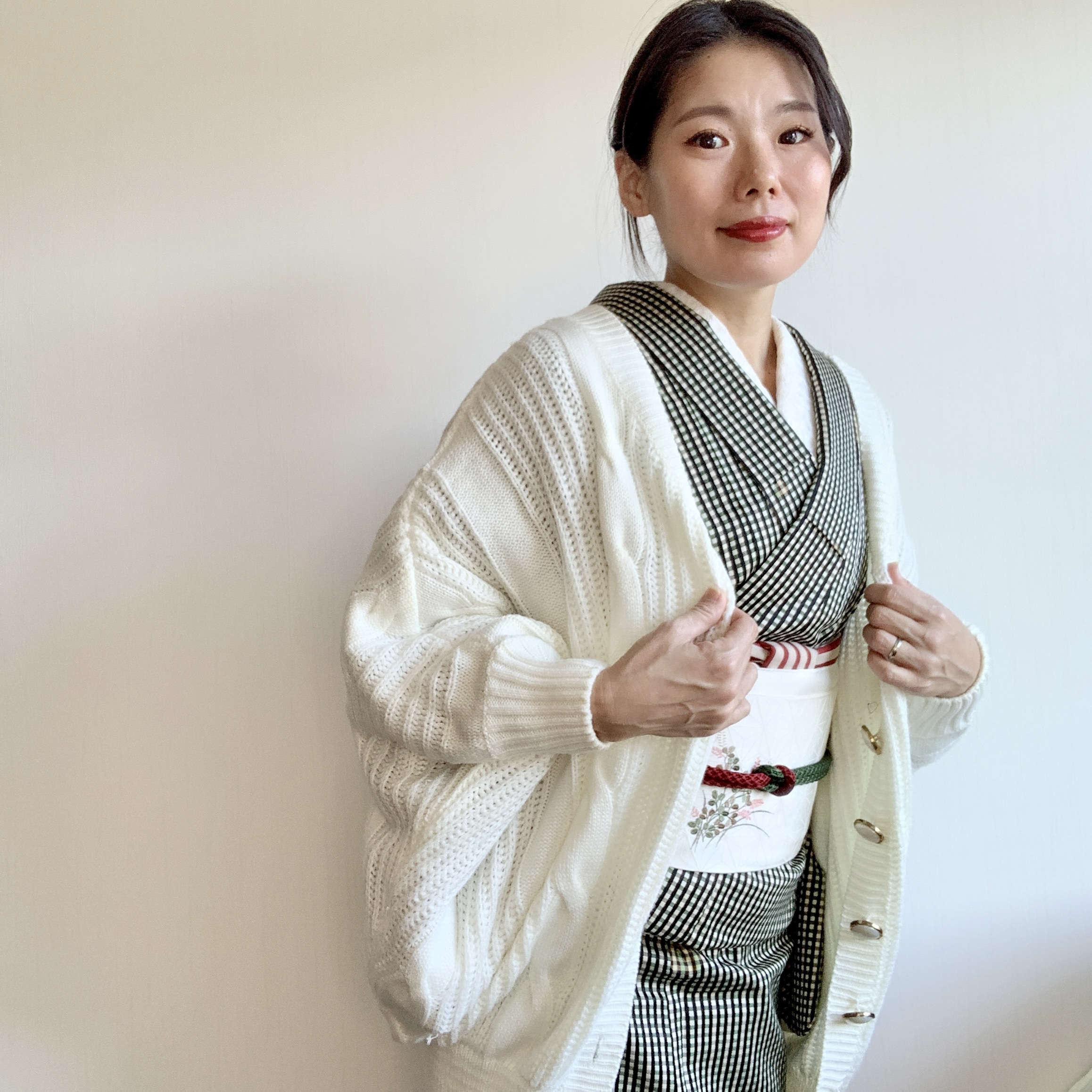ボタンをしめたり、羽織紐(カニカンタイプ)をつけてのアレンジも。ほっこりあたたかいカーディガンコーデ、ぜひお試しください♪