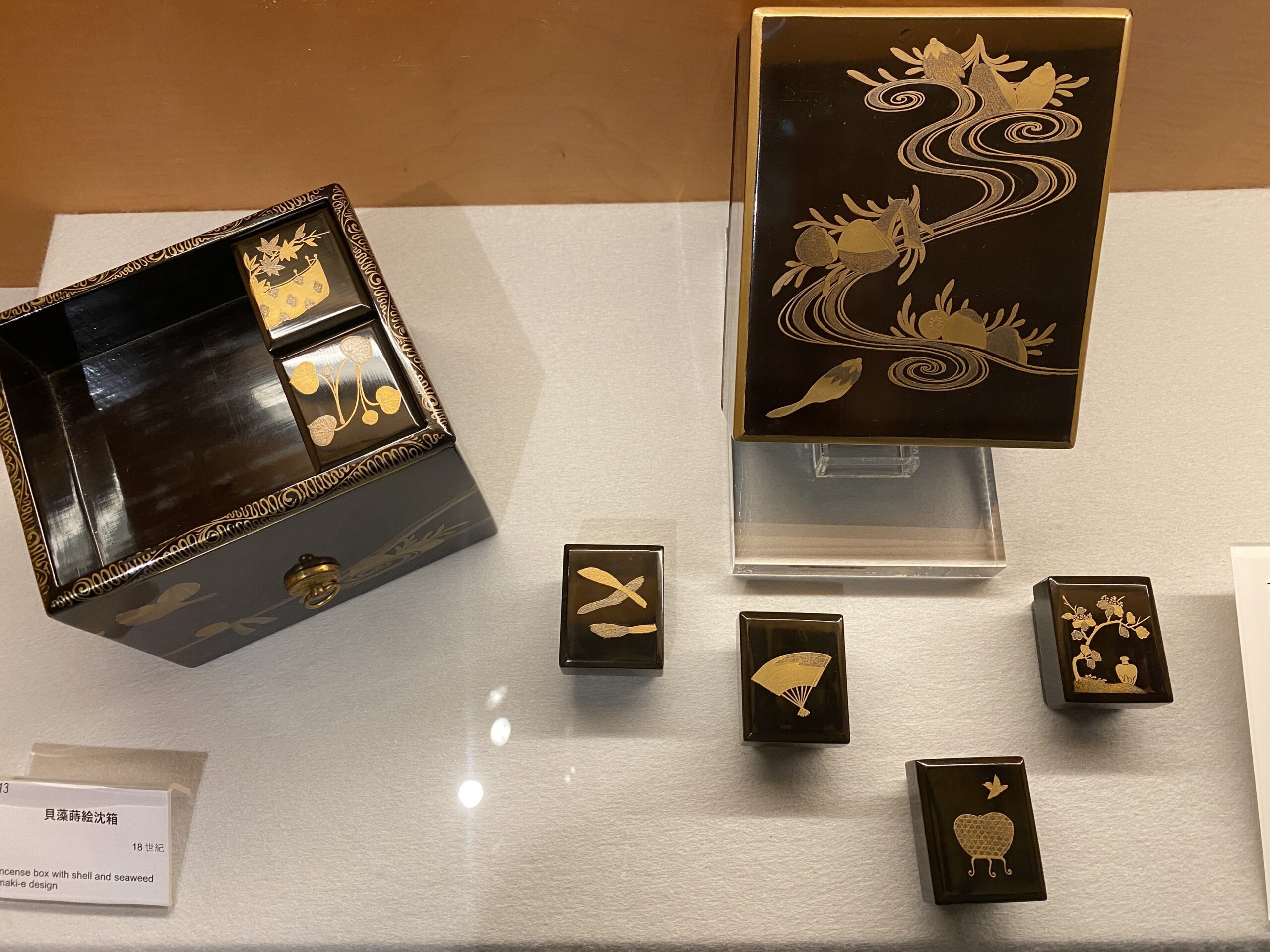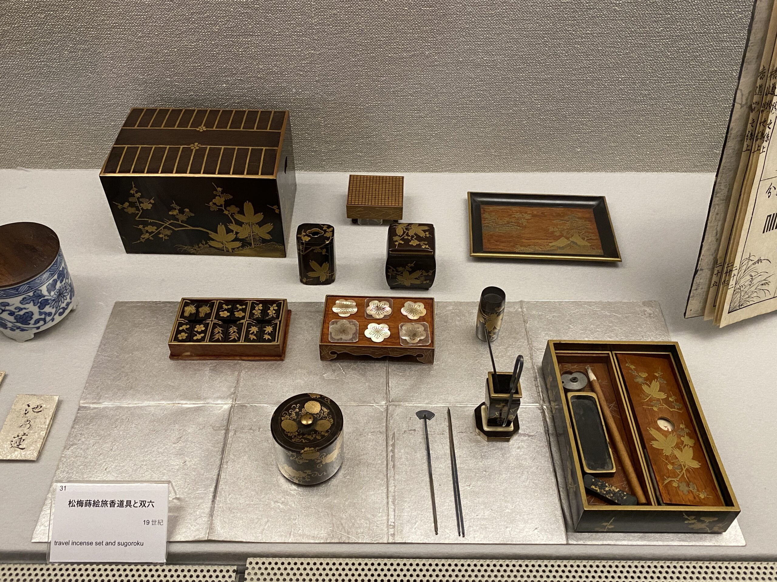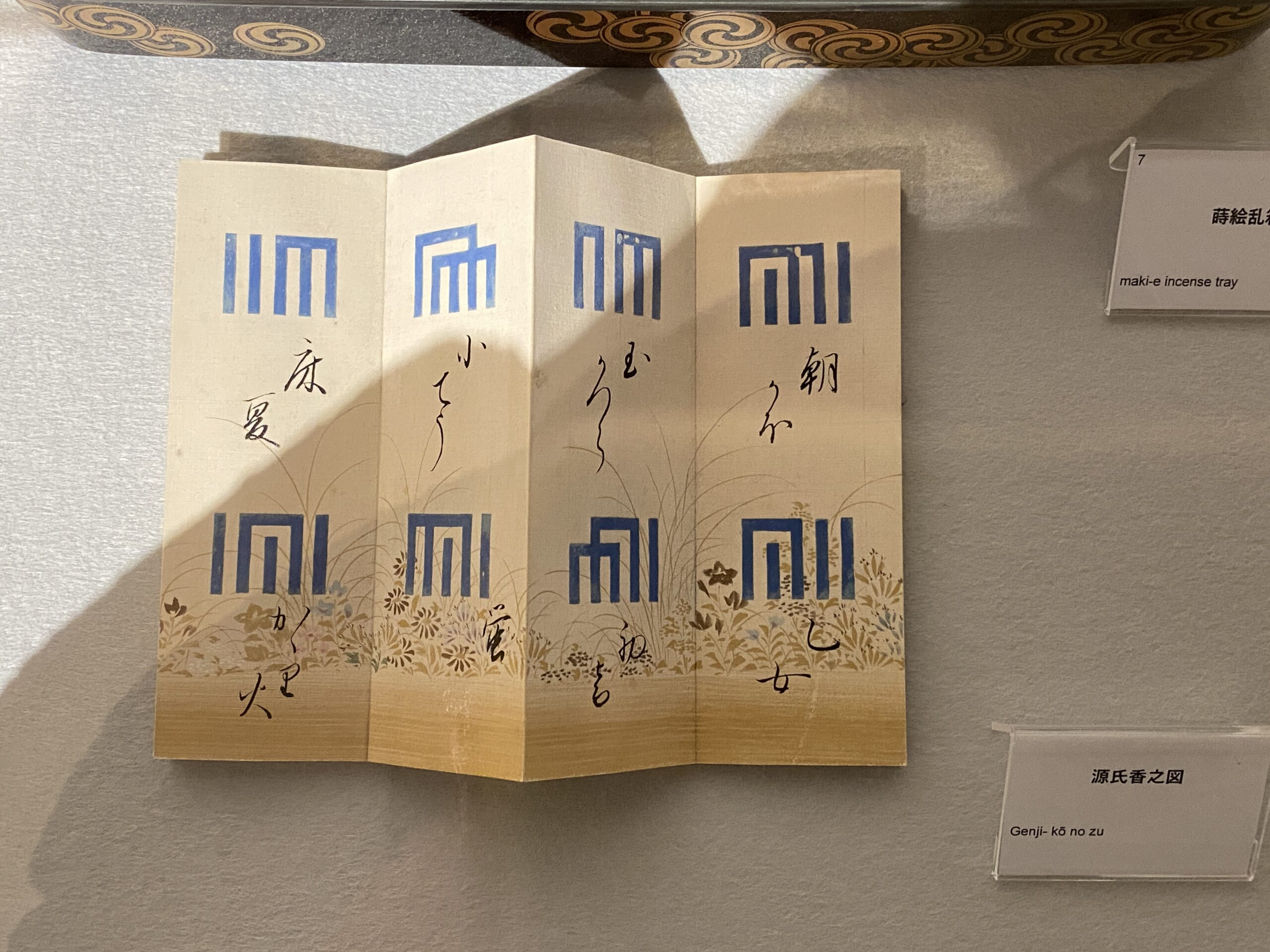 他に私が気になった展示は、江戸時代の香道の様子を描いた浮世絵「江戸名所百人美女 小石川牛天神合」、着物の文様としても人気の「源氏香之図」、小さな旅行用の香道具など…、繊細で優雅な美しさに、つい見入ってしまいました。