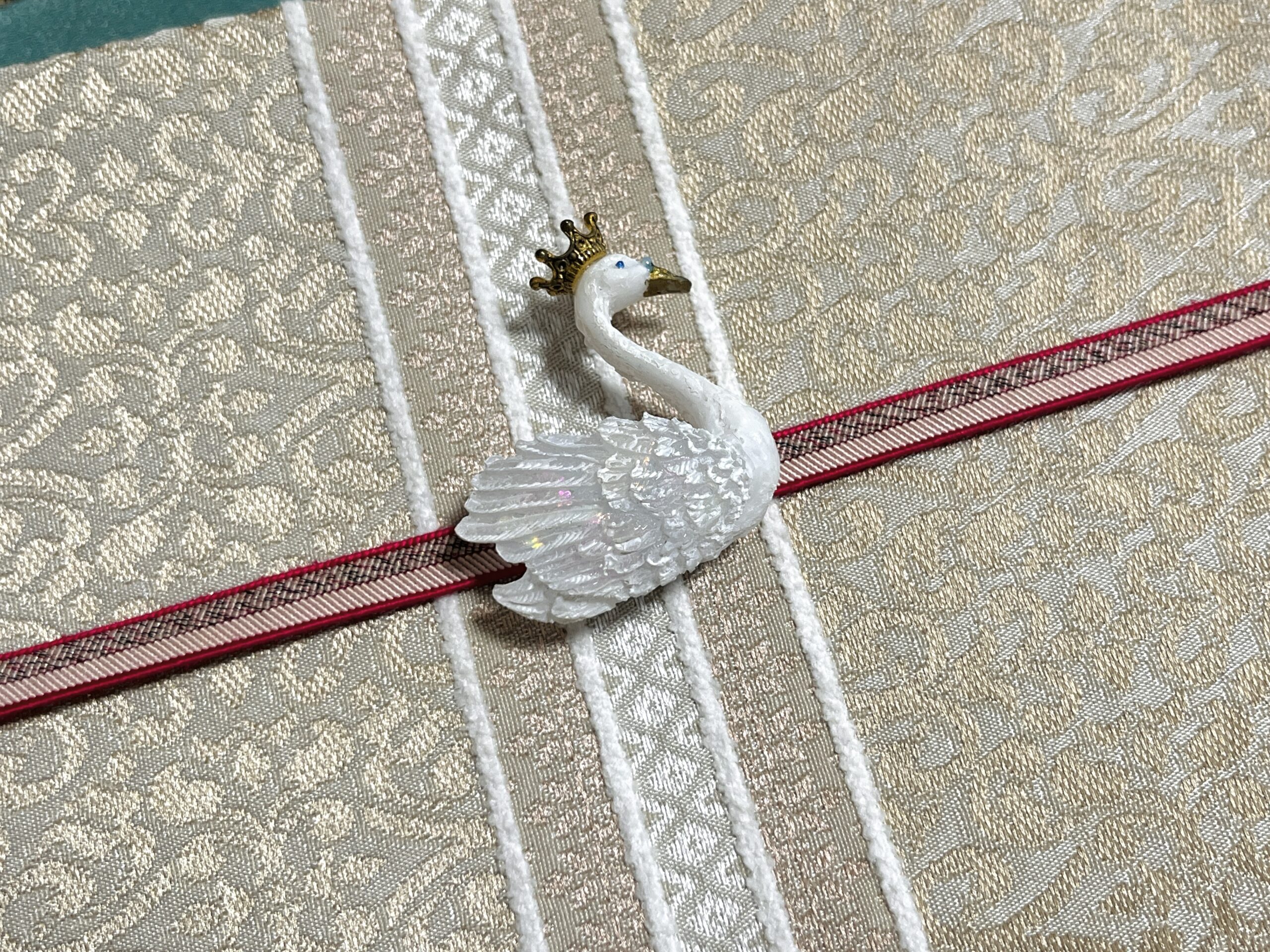 よく見ると、白鳥の帯留に入っているホログラムのキラキラがピンク色。