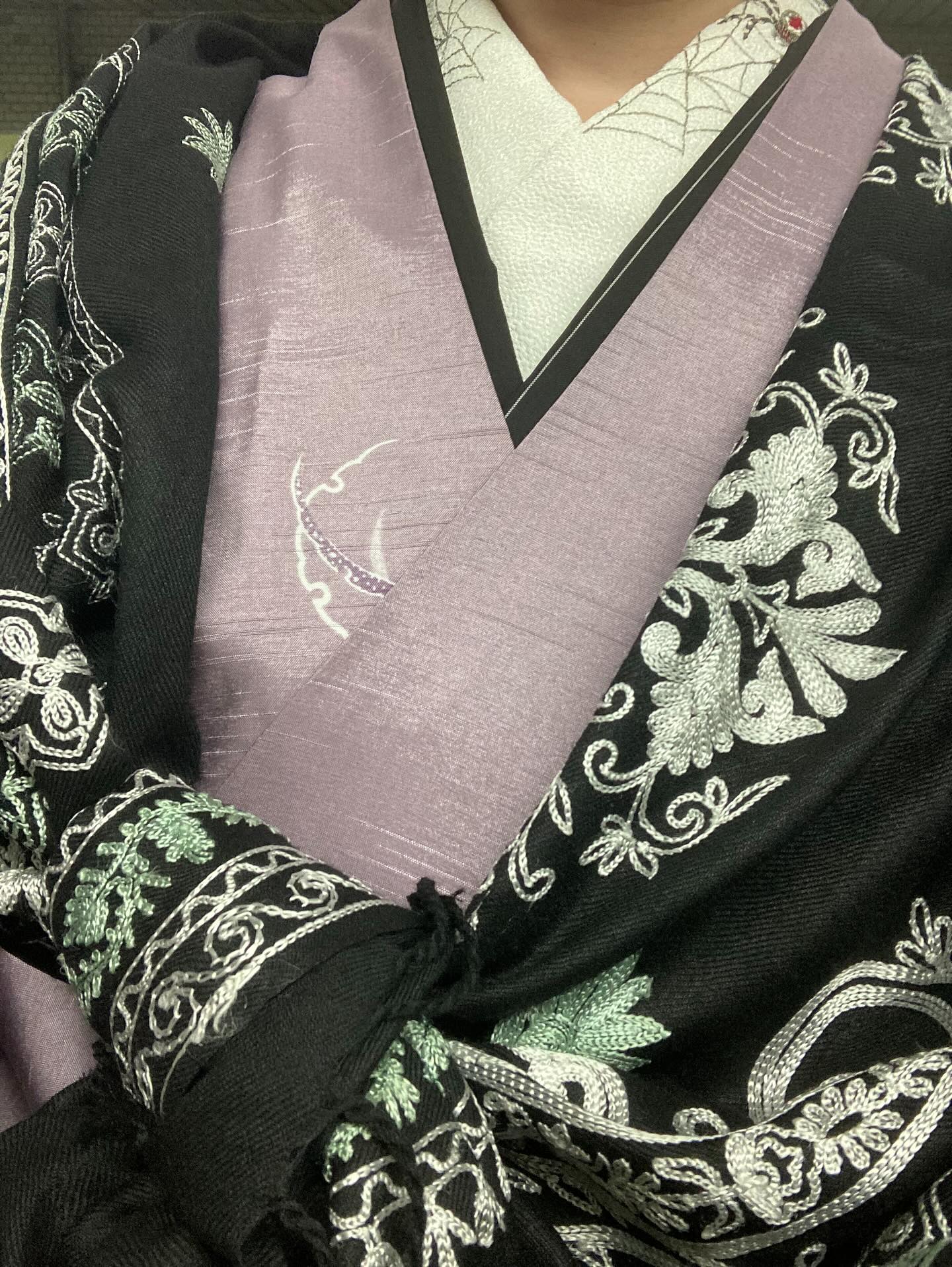 半襟は,蜘蛛柄です.蜘蛛というと気持ちが悪いという方がいるかもしれませんが,中国では,天から地へ送られた幸運の使い手という意味があったようです.ちなみに私はこの蜘蛛柄の半襟を,ハロウィン以外に歌舞伎や能の演目の『土蜘蛛』の時に使用します.