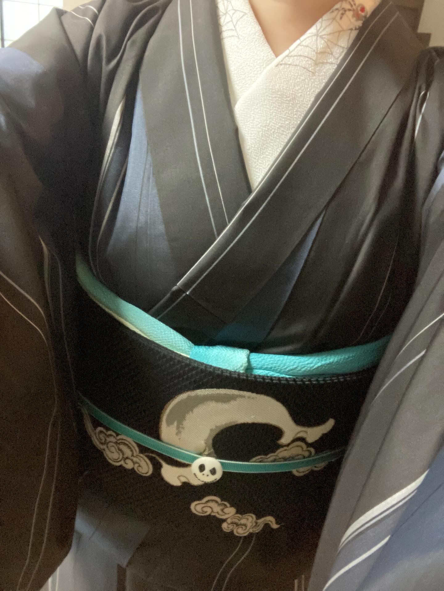 帯の柄は風神雷神.ちょっと間抜けな骸骨の帯留もユーモラスです.