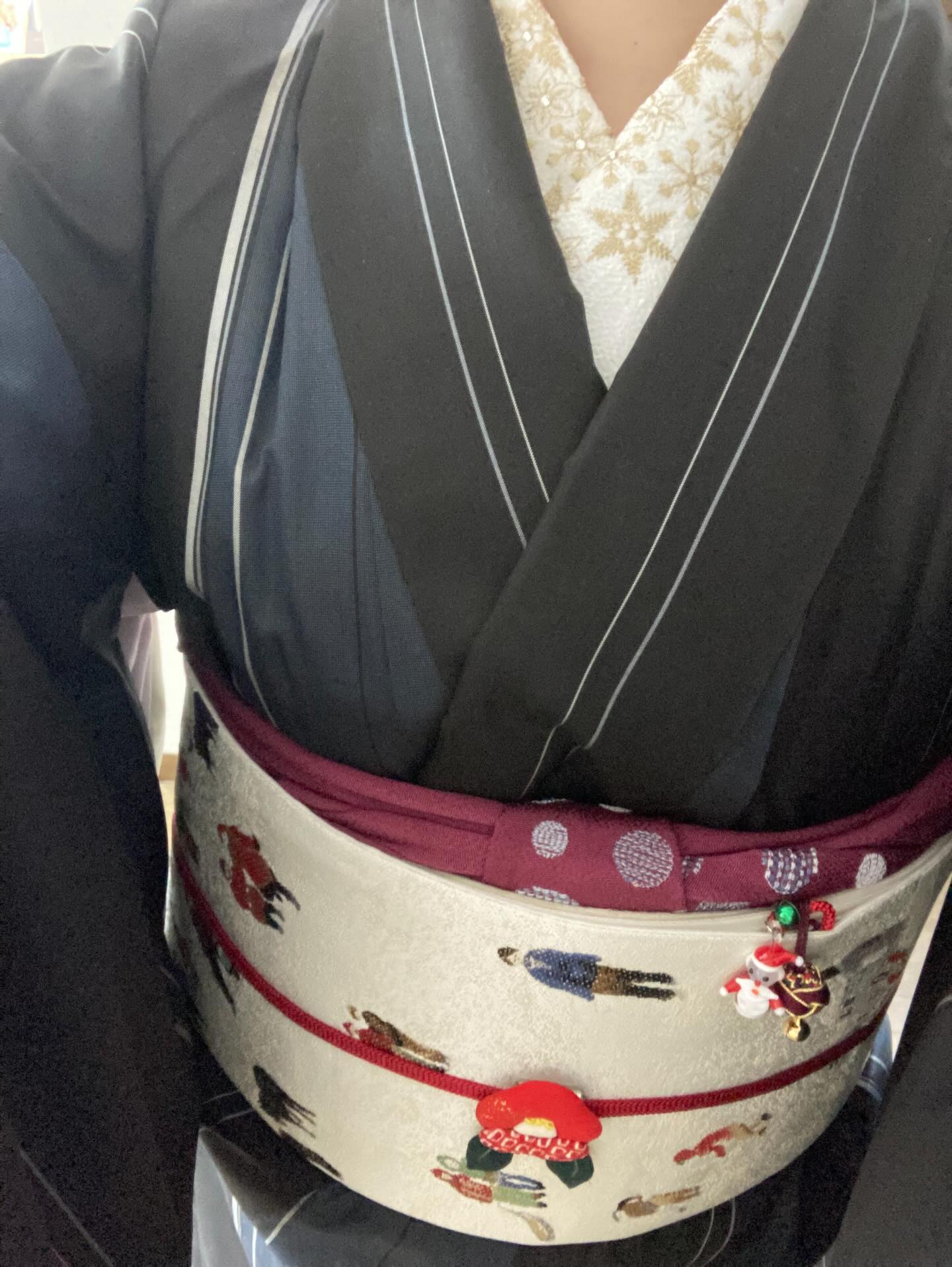 私の今回のコーディネートは,冬の札幌のイメージです.帯は冬の風景.原画展のポスターにちなんで赤を効かせたました.