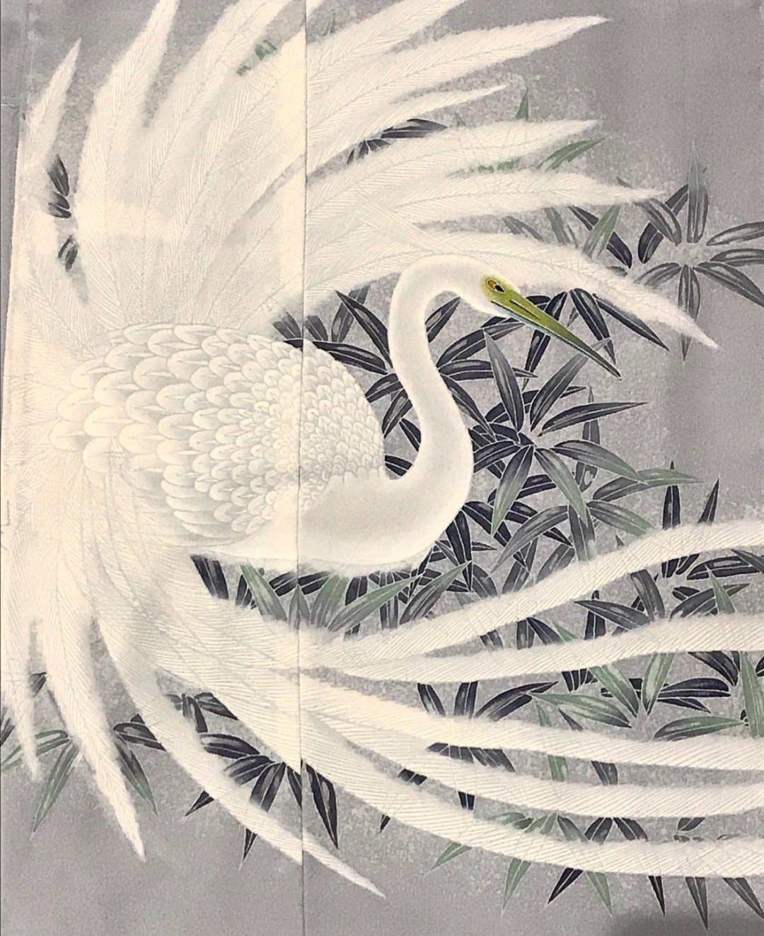 鷺は、着物の柄の場合、頭に長い毛(羽根??)がある場合もある。飛ぶ姿は首が湾曲しているらしい。