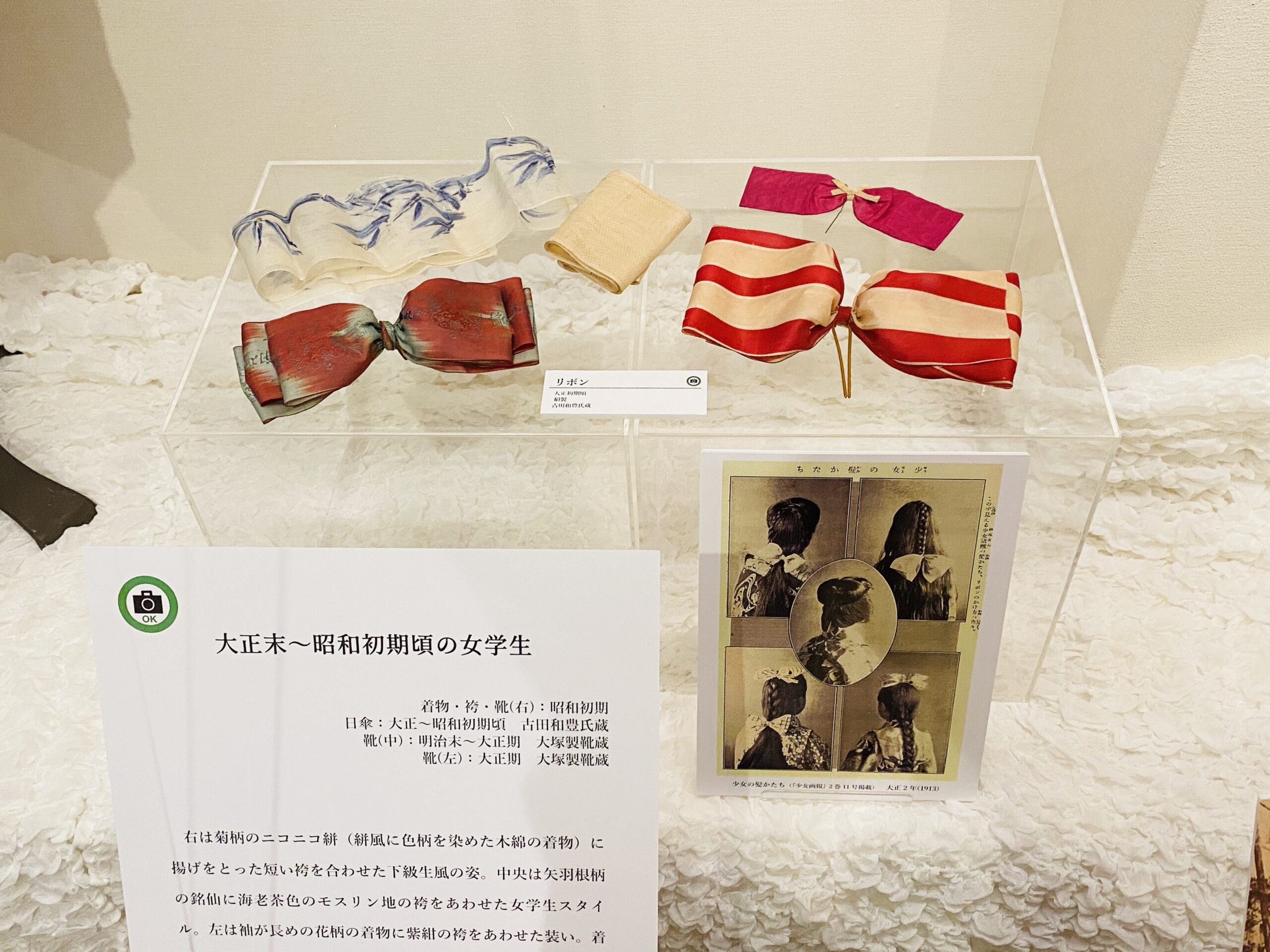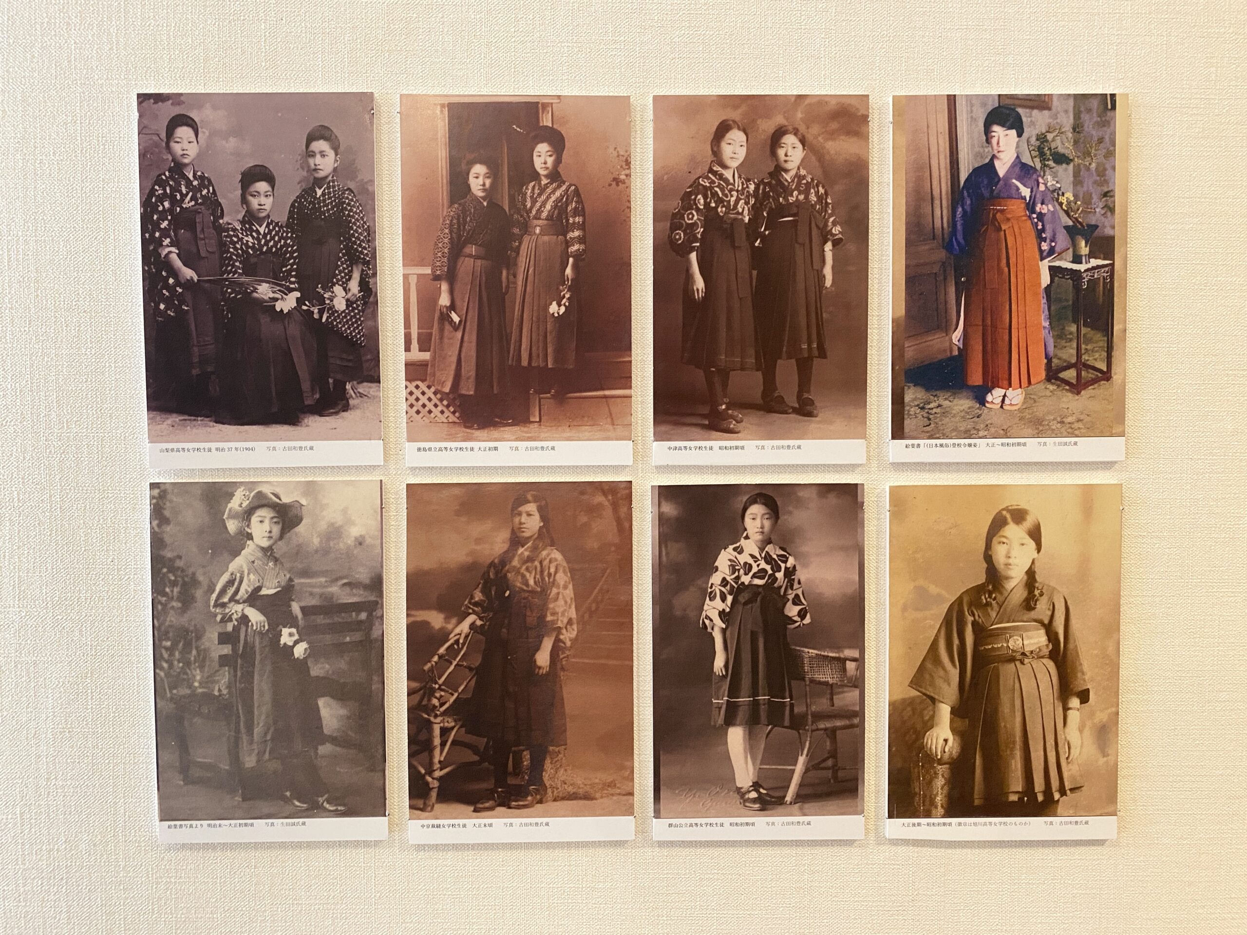 女学校の制服姿。それぞれの学校の個性があり、徽章(きしょう)付きのバックルベルトの格好良さには、思わず見惚れてしまいました。もし、この時代に生まれていたら、どんな風に着こなしていたかしら……と想像が膨らみます。