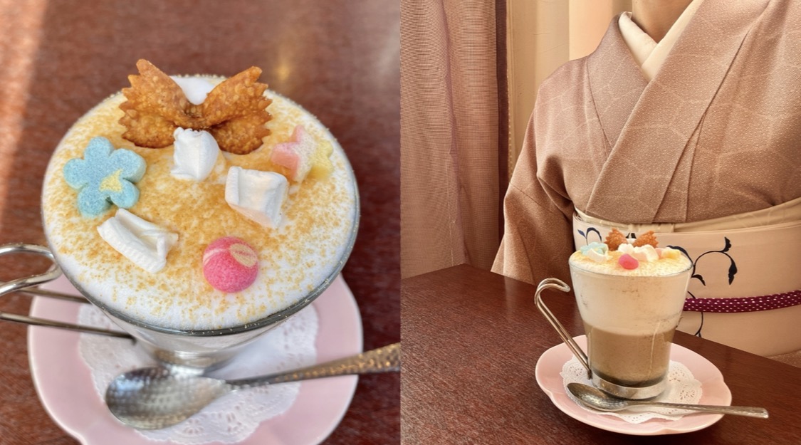 カラフルなお麩がトッピングされ、女学生の髪飾りをイメージしたシナモンシューガー味のリボンパスタに胸キュンなラテです。可愛い余韻につつまれたひとときでした。