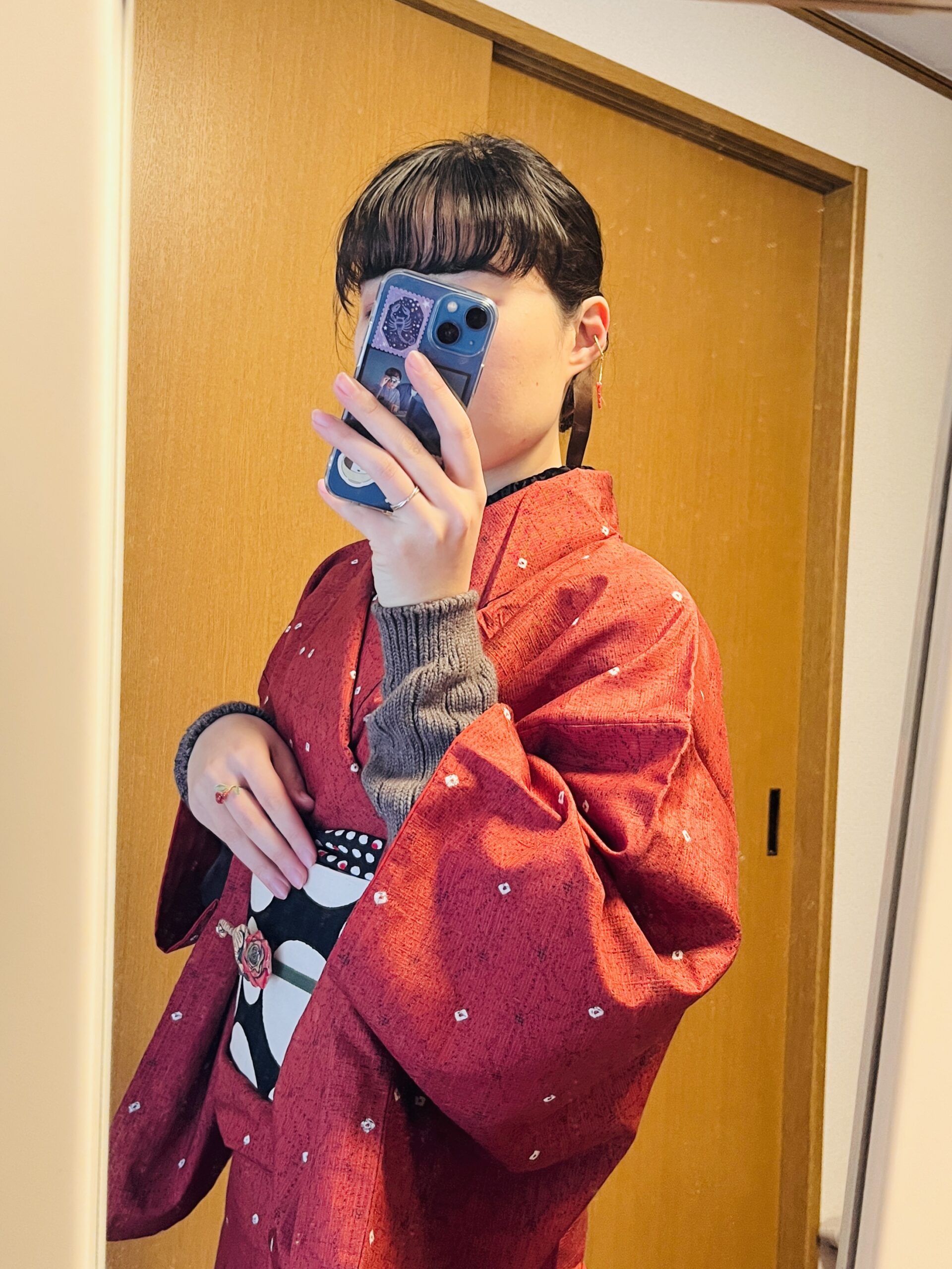 着物の麻の葉模様も幾何学模様。和柄の中では「和」の要素も強すぎず、ドット柄とも相性がいいです。
