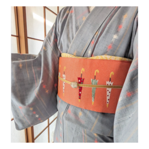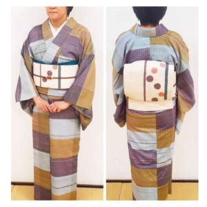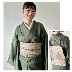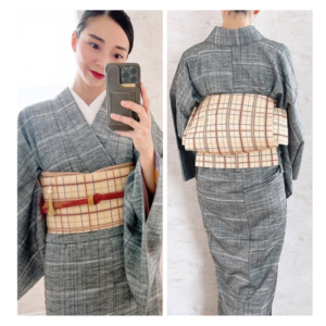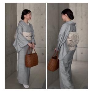 真綿の着物は素朴で上品な風合いなので、帯や小物で表情を変えるのがおすすめです。