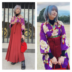 鮮やかな着物に緋色の袴を合わせた、凛と華やぐ冬スタイル。