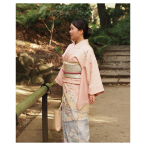 淡い桜色の着物で、やさしく柔らかな色合いが際立ちます。