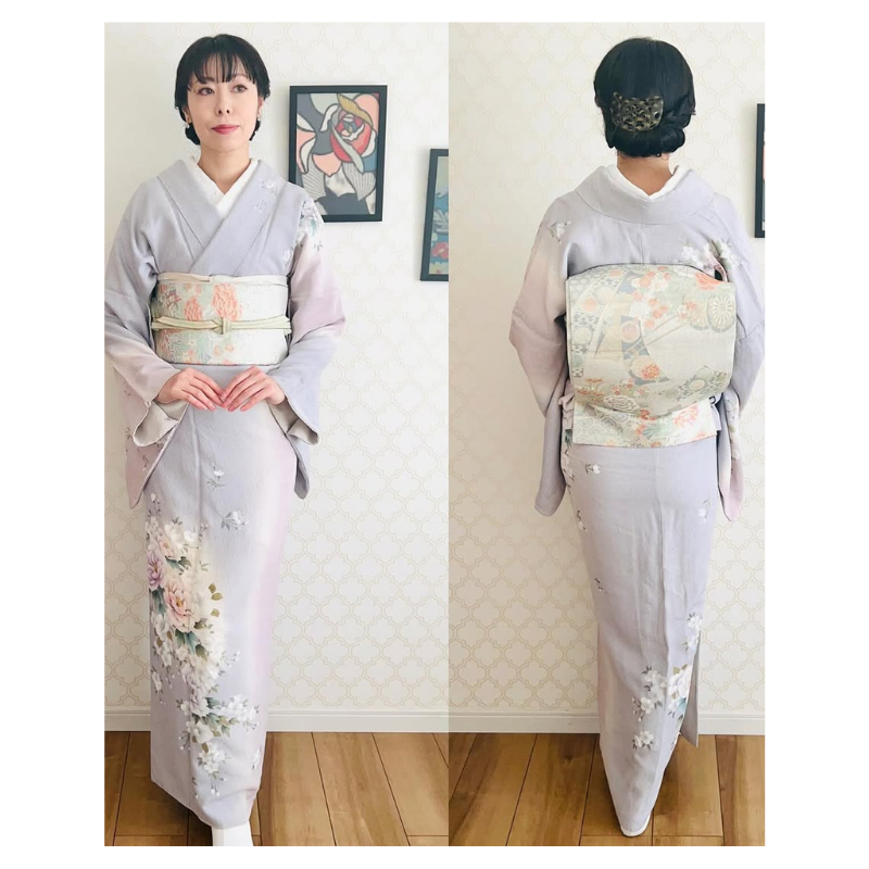 訪問着は裾から肩にかけて続く絵羽模様が特徴で、華やかさと格式を兼ね備えています。