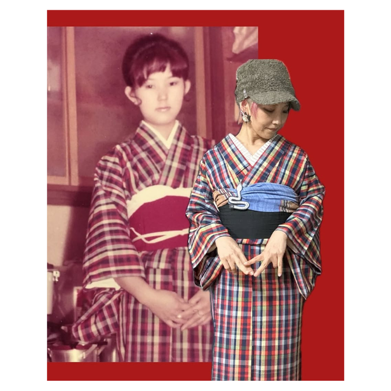 譲られた着物に袖を通す半衿(はんえり)や帯揚げ、帯締めなどで遊び心を加えると、チェック柄の魅力がさらに引き立ちます。